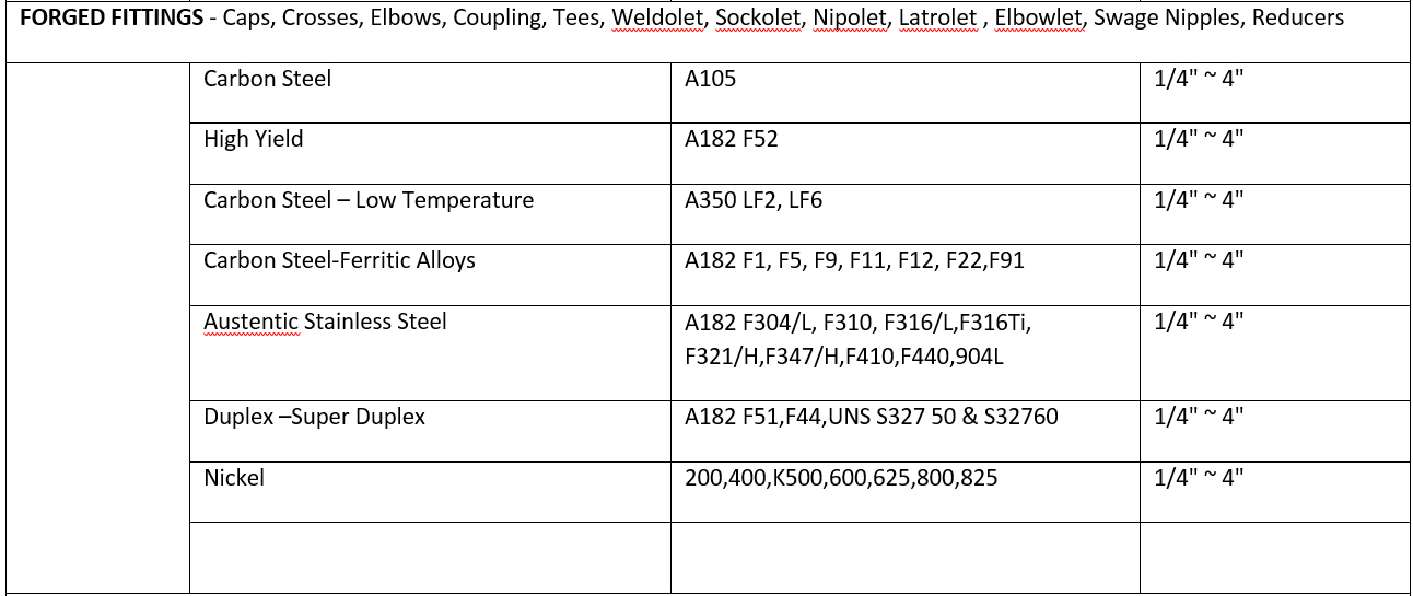 Grades: A105, A350, A420, A234, A182, A403, A815, WPB, WPL6, LF2, 304/L, 316/L, WPHYX42 to X60, F11 to F91, WP11 to WP91, UNS31803, 321, NACE MR‐01‐75