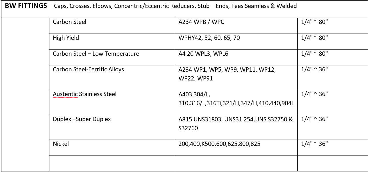 Materials : Carbon Steel, Alloy steel, Low Temp, Stainless Steel, Chrome, Aluminum, Duplex, , Inconel, Nickel Alloys, Hastelloys, Titanium