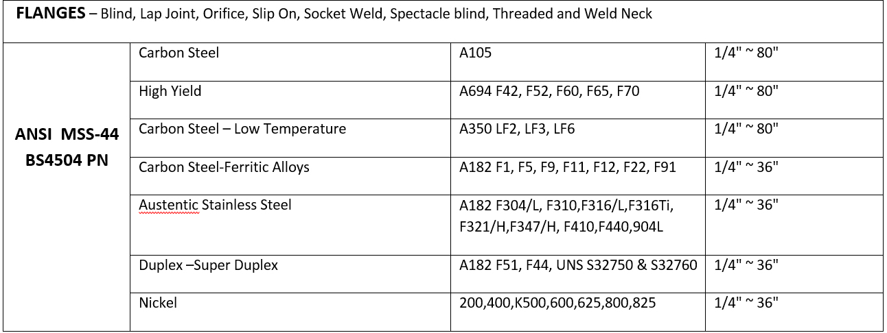 Types : Weld Neck, Slip‐On, Socket Weld, Blind, Threaded, Lap Joint, Long Weld Neck, Anchor, Orifice, Spectacle Blind, Swivel